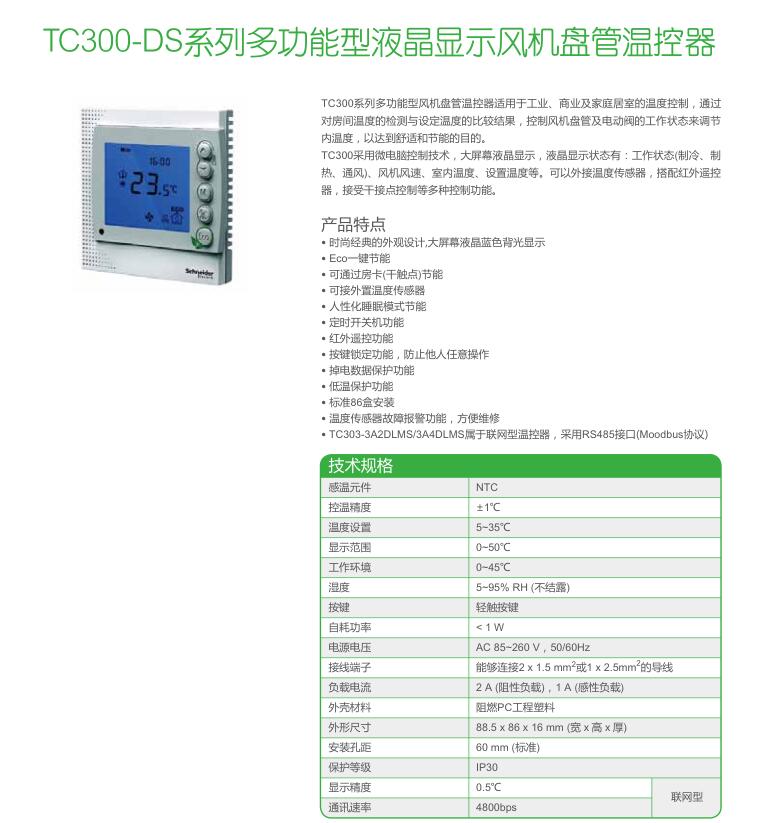 • TC300-DS系列多功能型液晶顯示風(fēng)機盤管溫控器